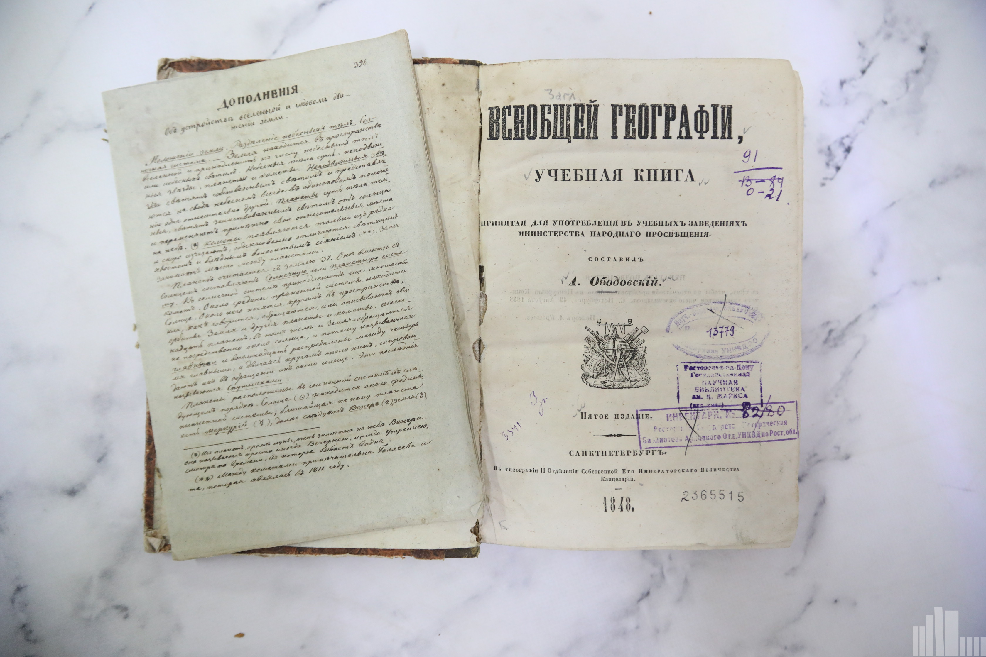 На выставке представлена учебная книга по всеобщей географии Александра Григорьевича Ободовского (1796 – 1852):