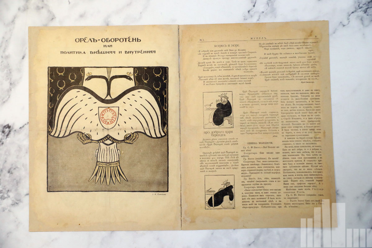 Один из разделов выставки представляет русскую сатирическую журналистику 1905-1907 годов. В это время выходило около 400 журналов, в которых на первом плане находились карикатура или рисунок, а текст лишь дополнял их.  Журналы оперативно откликались на злободневные вопросы общественно-политической жизни, на события крупномасштабные и более мелкие, частные. Предметом сатиры являлись бюрократия, военно-полицейский метод управления государством, придворная клика. Карикатуристы и сатирики не щадили и личности самого императора.