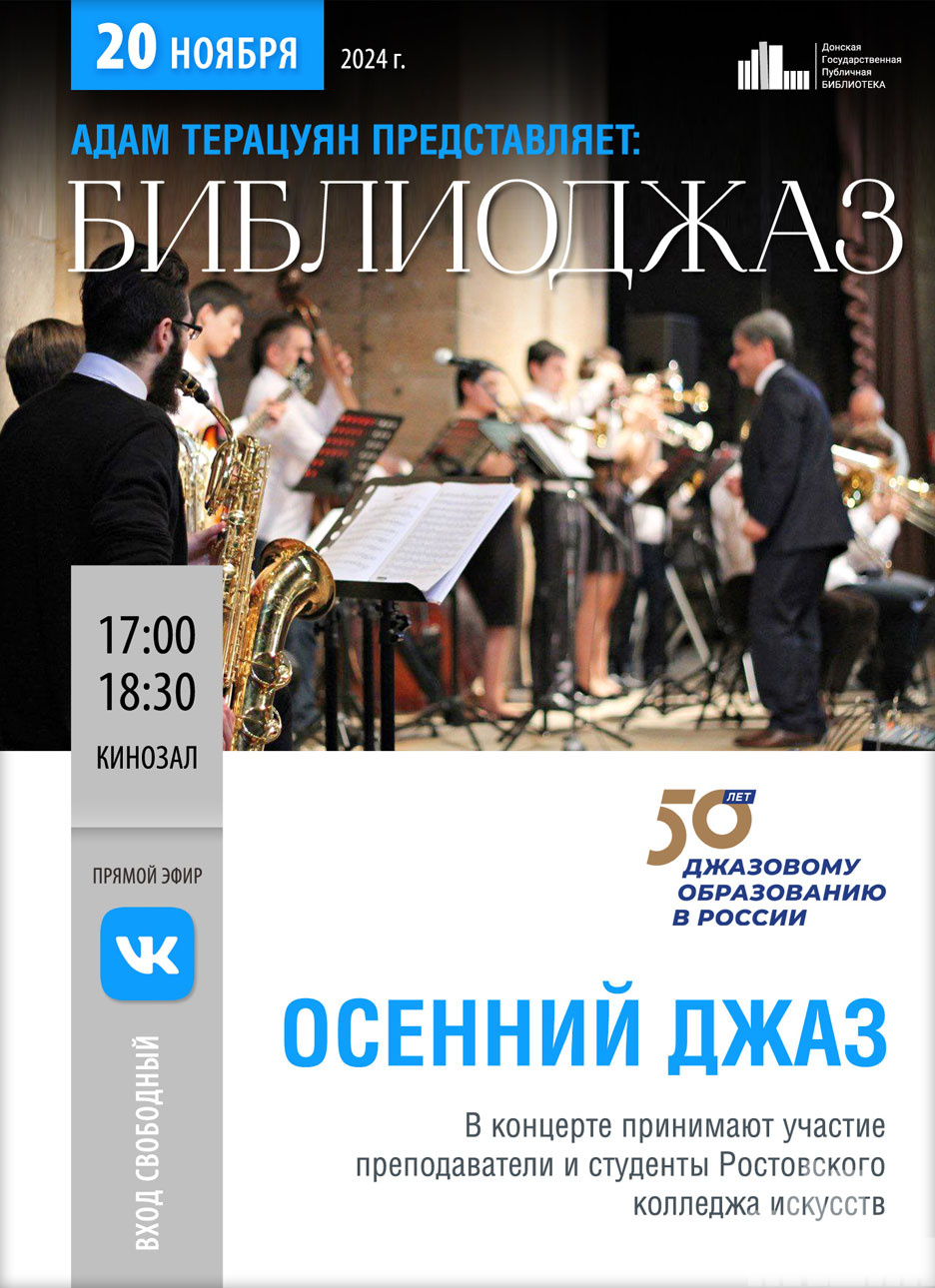 С программой «Осенний джаз» для вас выступят студенты и преподаватели Ростовского колледжа искусств. Прозвучит современная джазовая классика, лучшие произведения отечественных авторов.
