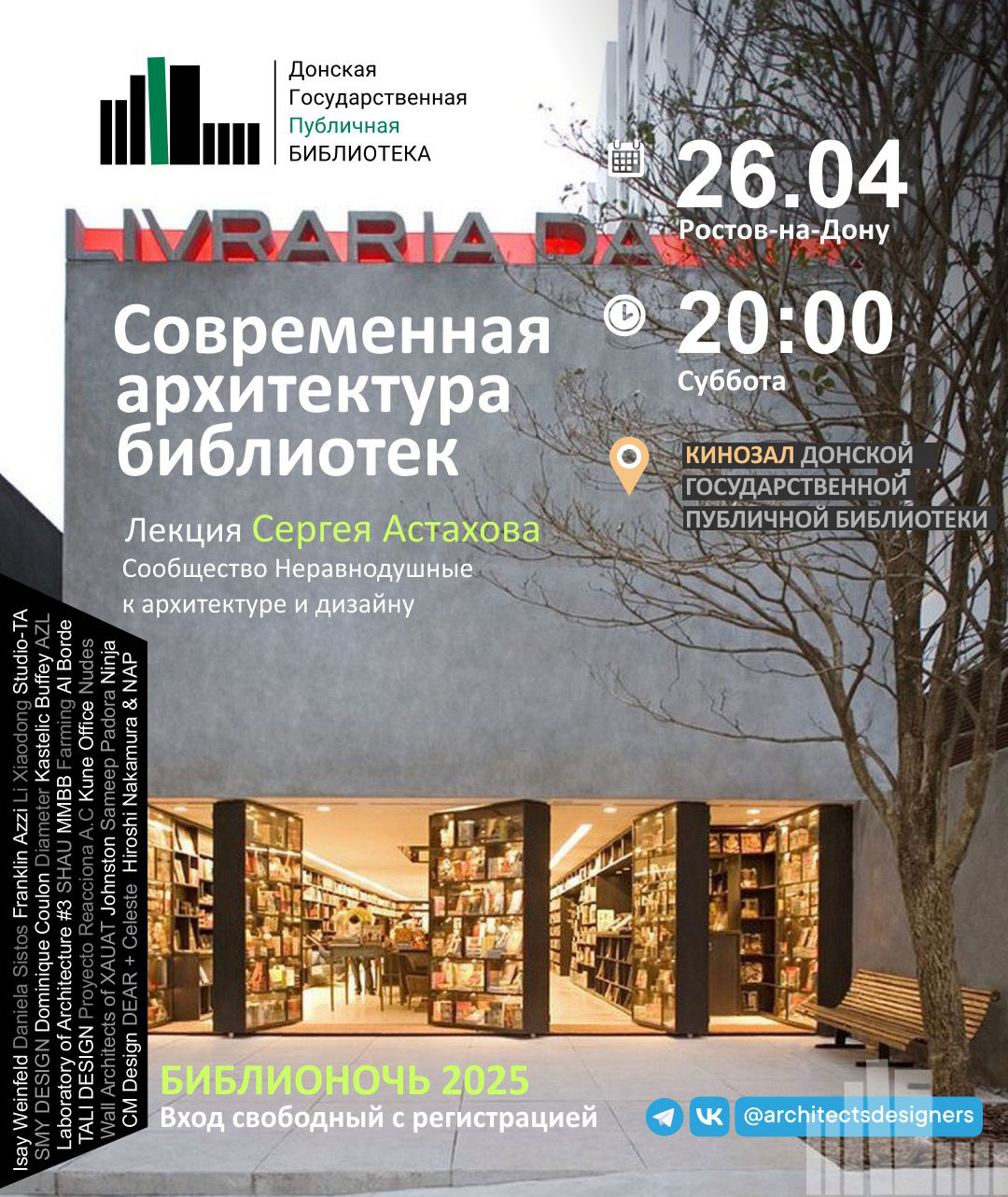 Лекция Сергея Астахова о современной архитектуре библиотек с обзором архитектурных экспедиций автора по известным зданиям библиотек и культурных центров Стамбула, Дели, Мумбаи, Рио-де-Жанейро, Сан-Пауло, Куритибы, Мадрида, Лиссабона, Москвы, Санкт-Петербурга, Ташкента, Баку, Тбилиси, Еревана, Ростова-на-Дону, Казани и др. городов.
