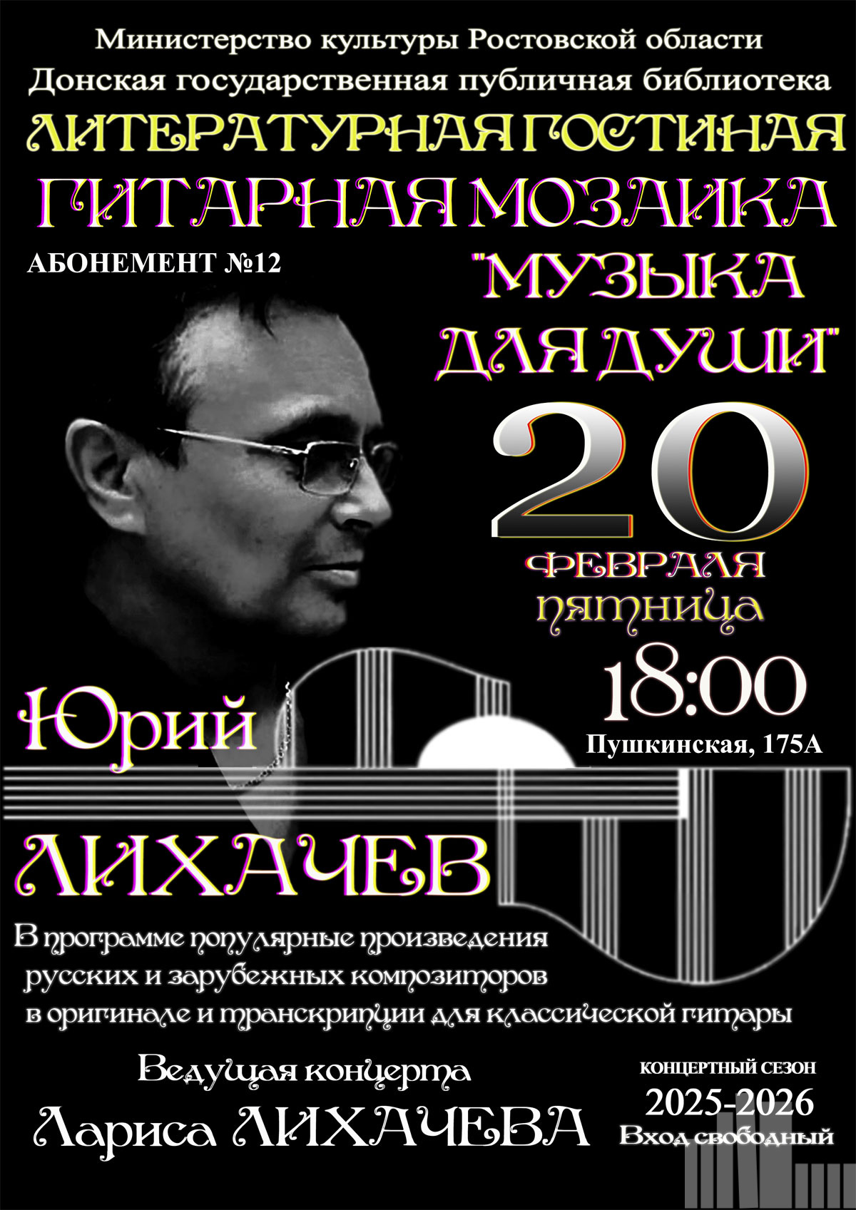 В камерной обстановке для всех любителей гитарной музыки прозвучат популярные произведения русских и зарубежных композиторов в оригинале и транскрипции для классической гитары.