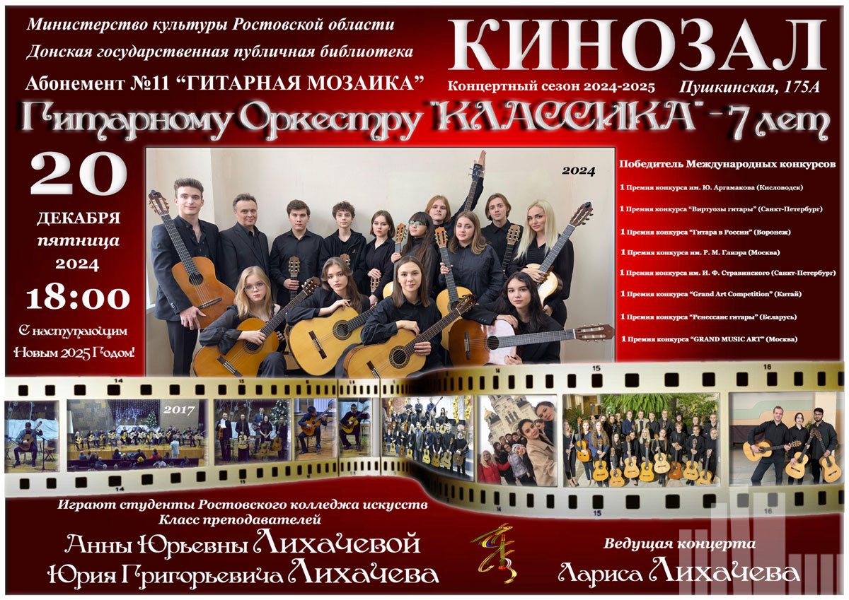 Гитарному оркестру «Классика» исполнилось 7 лет, он продолжает радовать всех любителей классической гитары прекрасной музыкой. В этот вечер для вас играют студенты Ростовского колледжа искусств, класс преподавателей А.Ю. Лихачёвой и Ю.Г. Лихачёва.