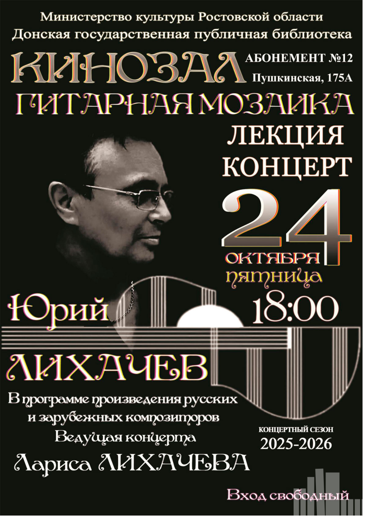 После летних каникул возобновляет свою работу абонемент «Гитарная мозаика». Всех любителей классической гитары ждет лекция-концерт, на которой в исполнении студентов и выпускников Ростовского колледжа искусств прозвучат произведения русских и зарубежных композиторов.