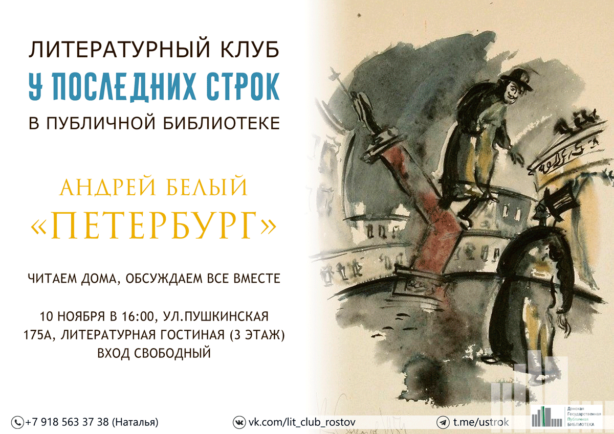 На очередной встрече литературного клуба разберём произведение Андрея Белого, одного из авторов Серебряного века, символиста и изобретателя оригинальной «орнаментальной» прозы, высшим достижением которой стал роман «Петербург».