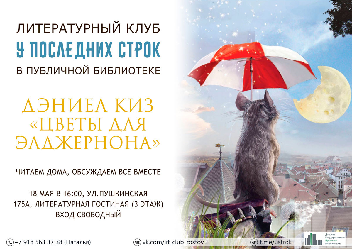 Участники рассмотрят роман американского автора Дэниела Киза «Цветы для Элджерона». Это одно самых человечных произведений новейшего времени о вопросах нравственности, любви и ответственности.