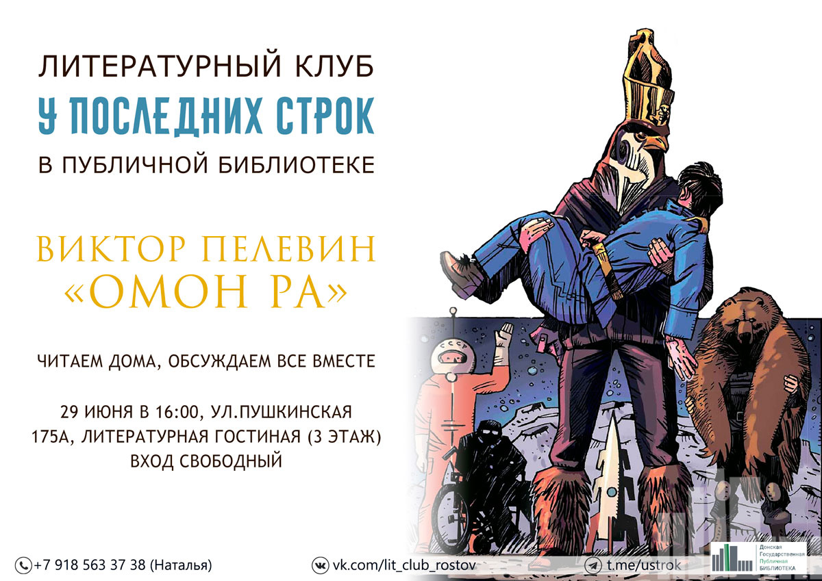 На очередной встрече клуба участники обсудят гротескный роман "Омон Ра" Виктора Пелевина. В 1993 году произведение было удостоено сразу двух литературных премий – «Интерпресскон» и «Бронзовая улитка» в категории «Средняя форма».