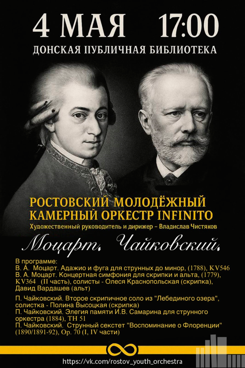 Ростовский молодежный камерный оркестр «Infinito» приглашает всех любителей классической музыки. Прозвучат несколько произведений двух выдающихся композиторов своей эпохи В.А. Моцарта и П.И. Чайковского.
