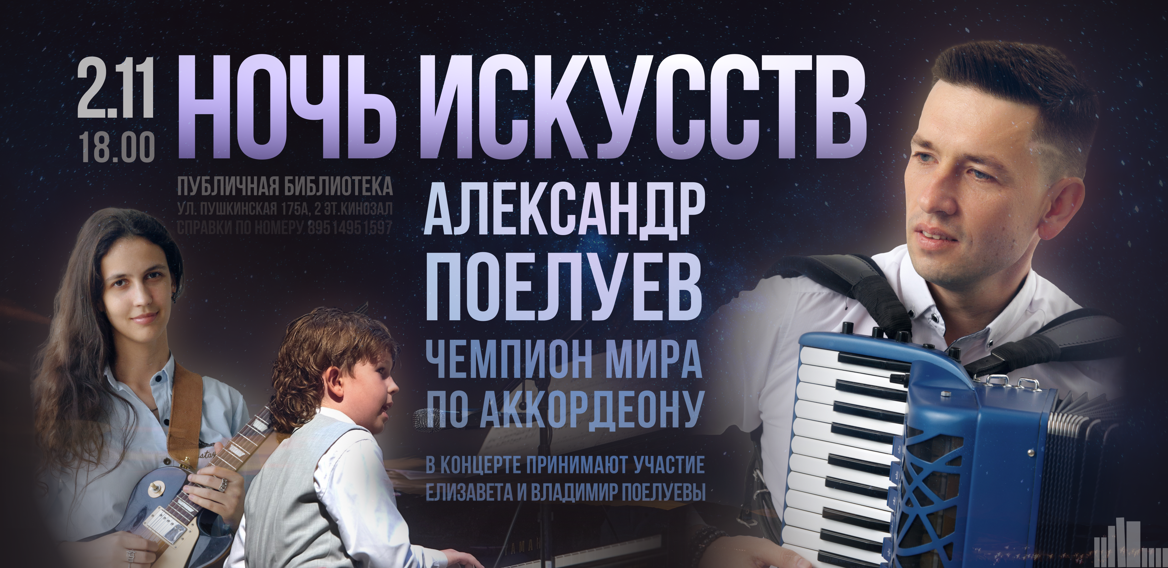 Чемпион мира по аккордеону Александр Поелуев представляет в «Ночи искусств» уникальный эксперимент. Его концерт не просто останется в памяти — он буквально оживёт на холсте!