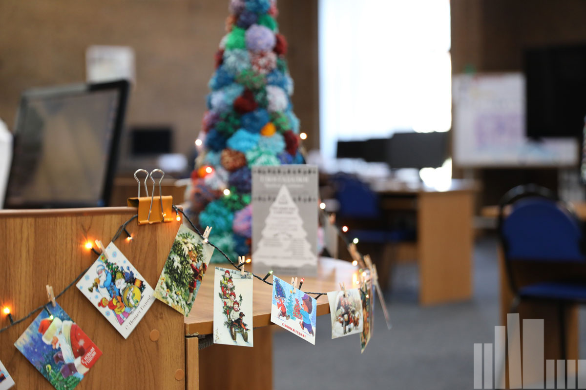 Праздничные елочки на кафедрах третьего этажа библиотеки предлагают книжное гадание.