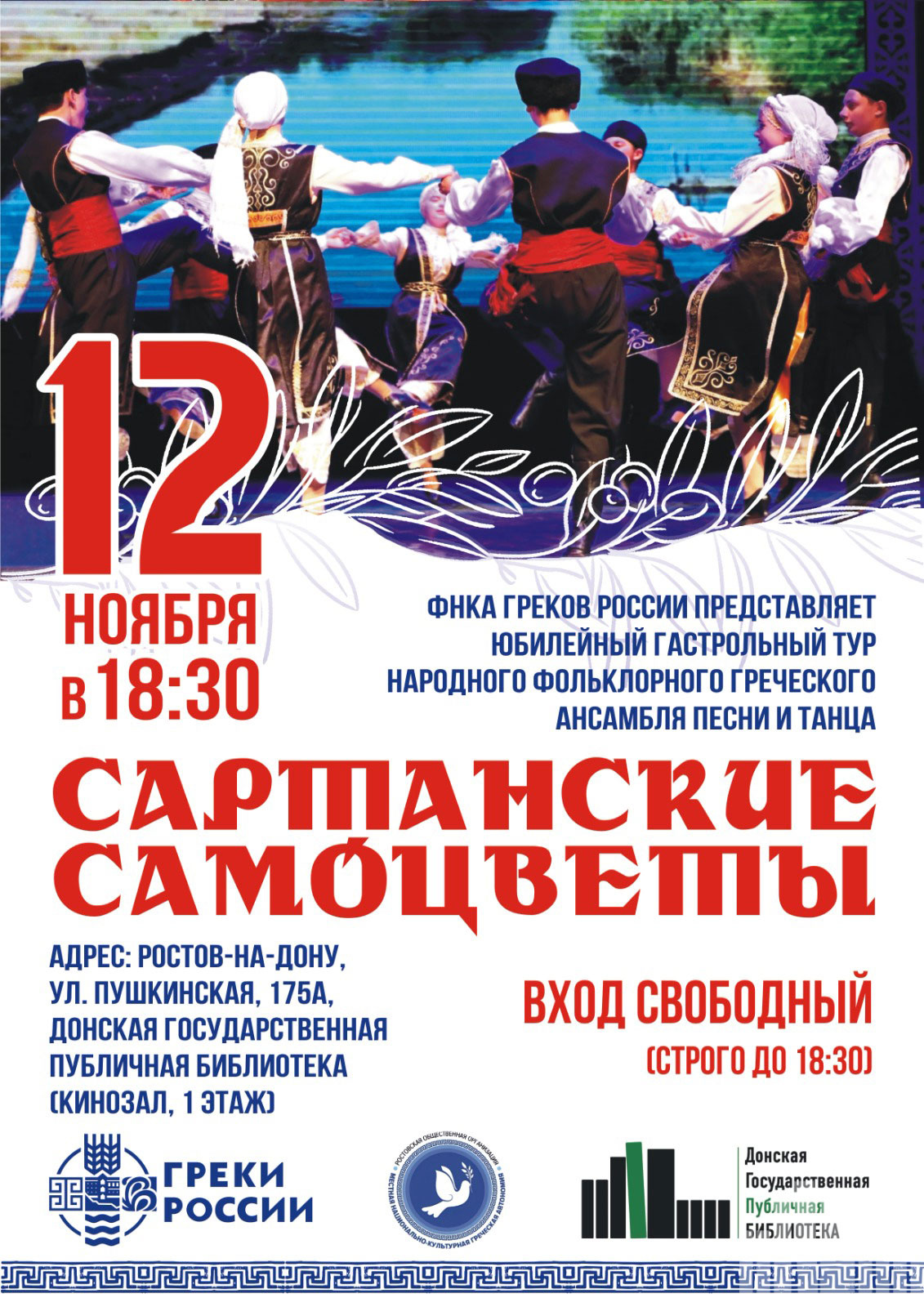 Греки Сартаны в гостях у греков Дона. Концерт приурочен к празднованию 90-летия ансамбля «Сартанские самоцветы». Вход свободный, ждём всех желающих.