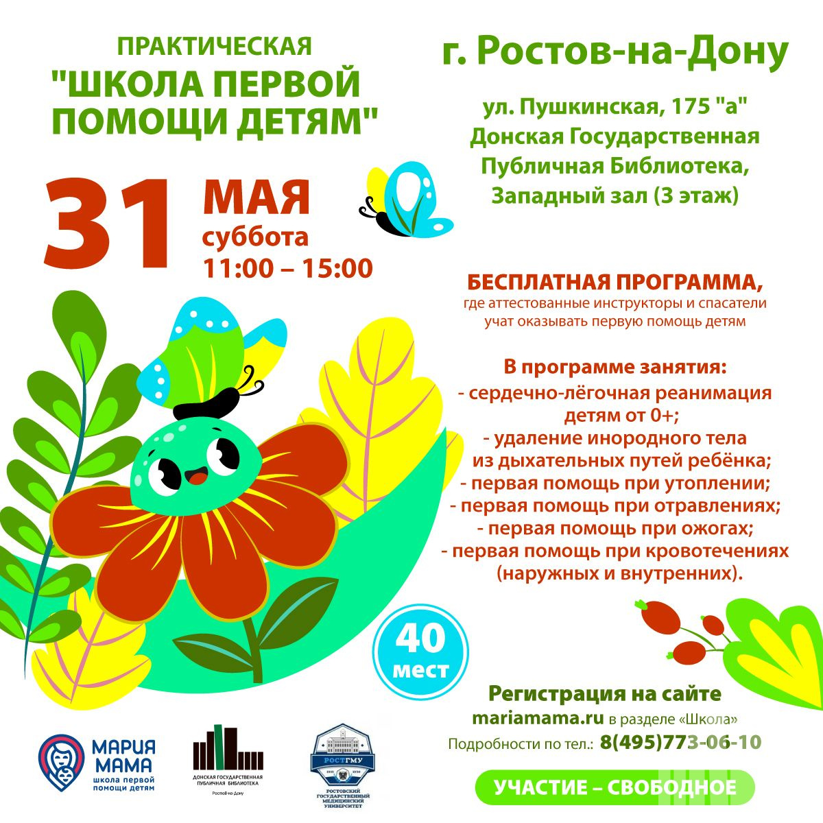 Практический мастер-класс по первой помощи детям от благотворительной организации «Мария мама» при поддержке фонда «Я есть!». Аттестованные инструкторы и спасатели научат оказывать первую помощь детям. Занятия будут проходить с использованием специальных манекенов-тренажеров, которые повторяют строение тела и анатомические особенности человека. В программе: