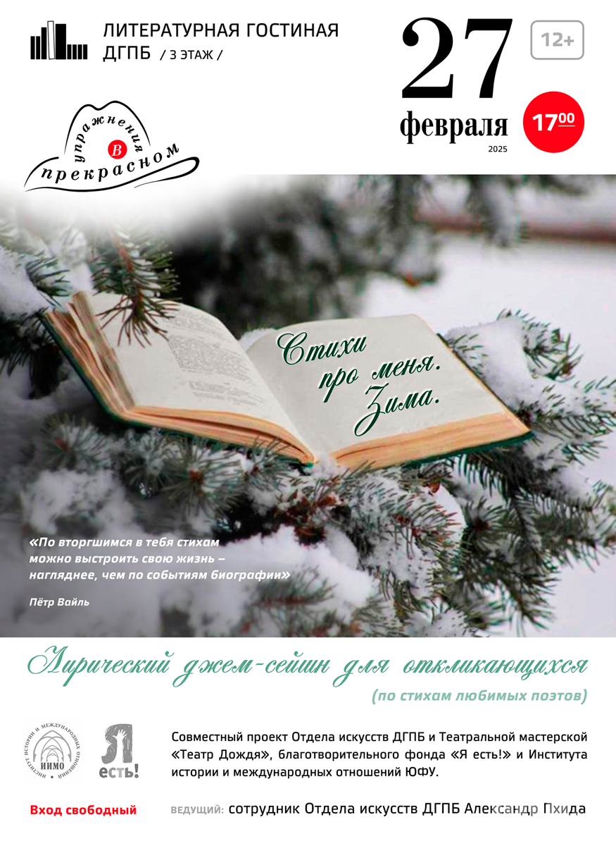 В рамках проекта «Упражнения в прекрасном» состоится поэтический вечер, подготовленный совместно отделом искусств ДГПБ, театральной мастерской «Театр Дождя» благотворительного фонда «Я есть!» и Институтом истории и международных отношений ЮФУ.