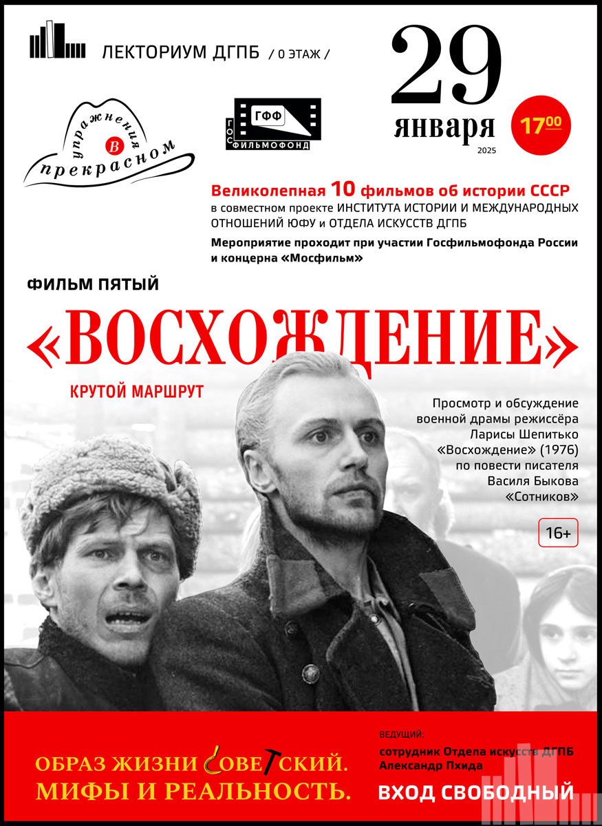 «Восхождение» - крутой маршрут. Так называется эта встреча, посвящённая уникальному советскому киношедевру режиссёра Ларисы Шепитько «Восхождение» (1976г.), снятому по повести «Сотников» замечательного белорусского писателя, фронтовика Великой Отечественной войны Василя Быкова. Главные роли в нём мечтали сыграть знаменитые советские актёры Андрей Мягков и Владимир Высоцкий. Но режиссёр, отказавшись от услуг популярных артистов, связанных в зрительском восприятии с другими сыгранными ими ролями, отдала предпочтение никому не известным в те годы: Борису Плотникову и Владимиру Гостюхину. Им предстояло, максимально погрузившись в реалии этой жестокой истории, пройти маршрутом страшных испытаний, выпавших на долю их героев, чтобы донести до нас важные и горькие истины, скрывающиеся за сюжетом этой «неопритчи». Истины необычайно актуальные в нашем сегодняшнем времени. Понять их или хотя бы прикоснуться к ним мы и постараемся на этом кинопросмотре.