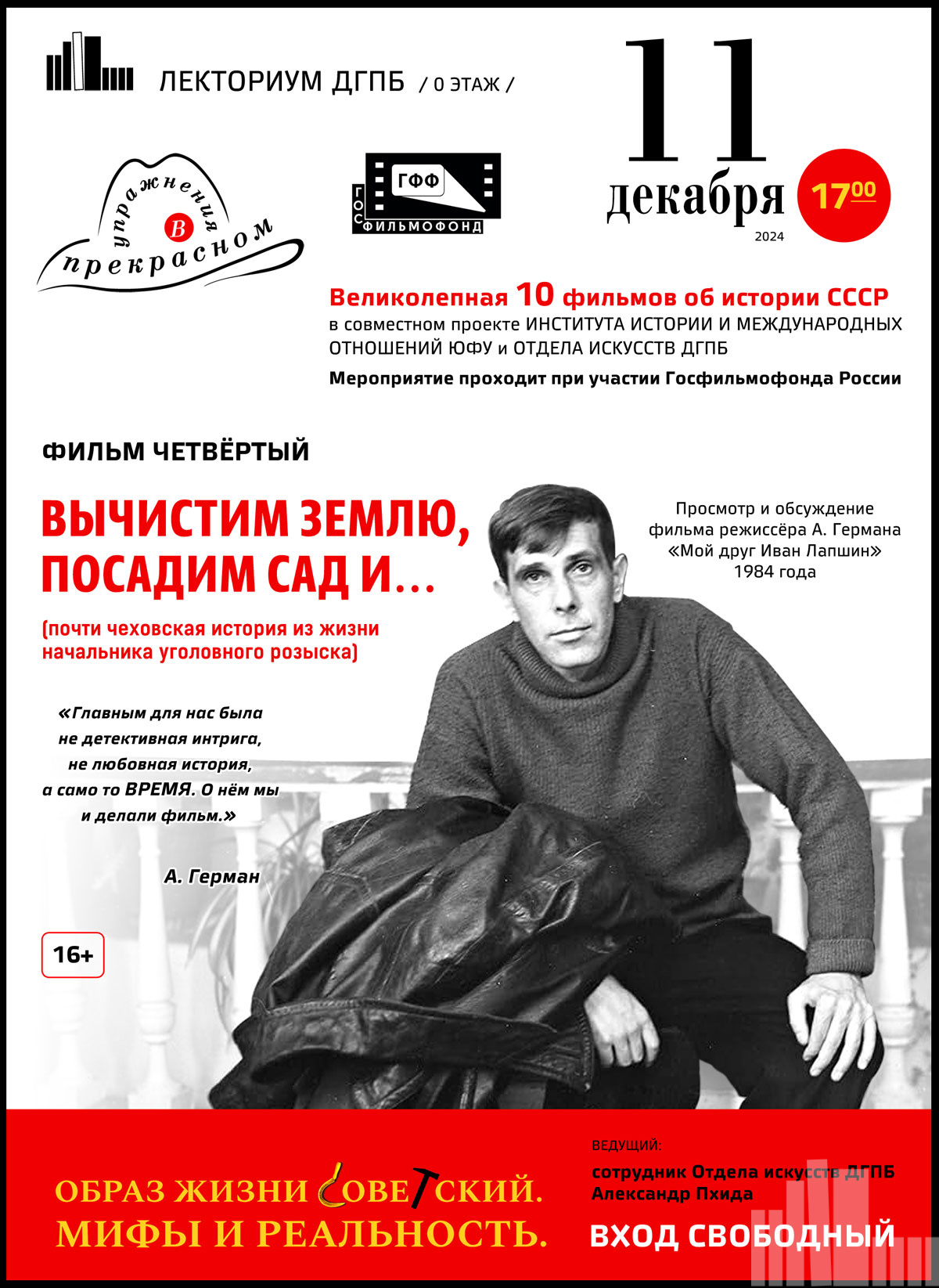 Фильм четвёртый ВЫЧИСТИМ ЗЕМЛЮ, ПОСАДИМ САД И… (почти чеховская история из жизни начальника уголовного розыска). Так называется эта встреча, которая посвящена фильму режиссёра Алексея Германа «Мой друг Иван Лапшин», снятому им в 1984 году по повести отца, писателя Юрия Германа, написанной в 1937 году.