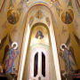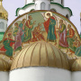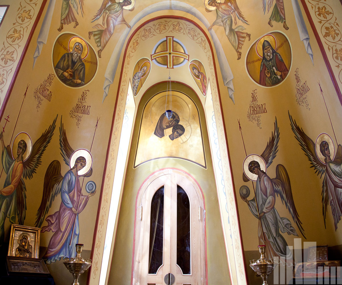 В храмовых росписях представлены духовные наставники Руси, которые благодаря подвижничеству и историческим деяниям во славу Руси, причислены к лику святых (храм Сергия Радонежского).
