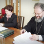 На встрече также присутствовали ученый секретарь ДГПБ Евгения Колесникова, проректор семинарии по учебной работе протоиерей Григорий Гриднев и библиотекарь Донской духовной семинарии Елена Ульченко.