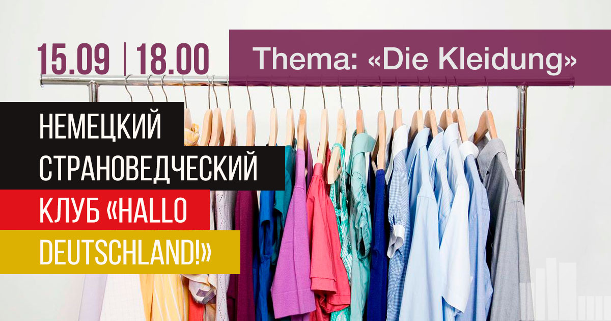 15 сентября в 18.00 на платформе Zoom состоится очередное заседание немецкого страноведческого клуба «Hallo Deutschland!». Тема встречи: «Одежда». Заявку на участие в онлайн-заседании присылайте на адрес: deutsch.dspl@gmail.com
