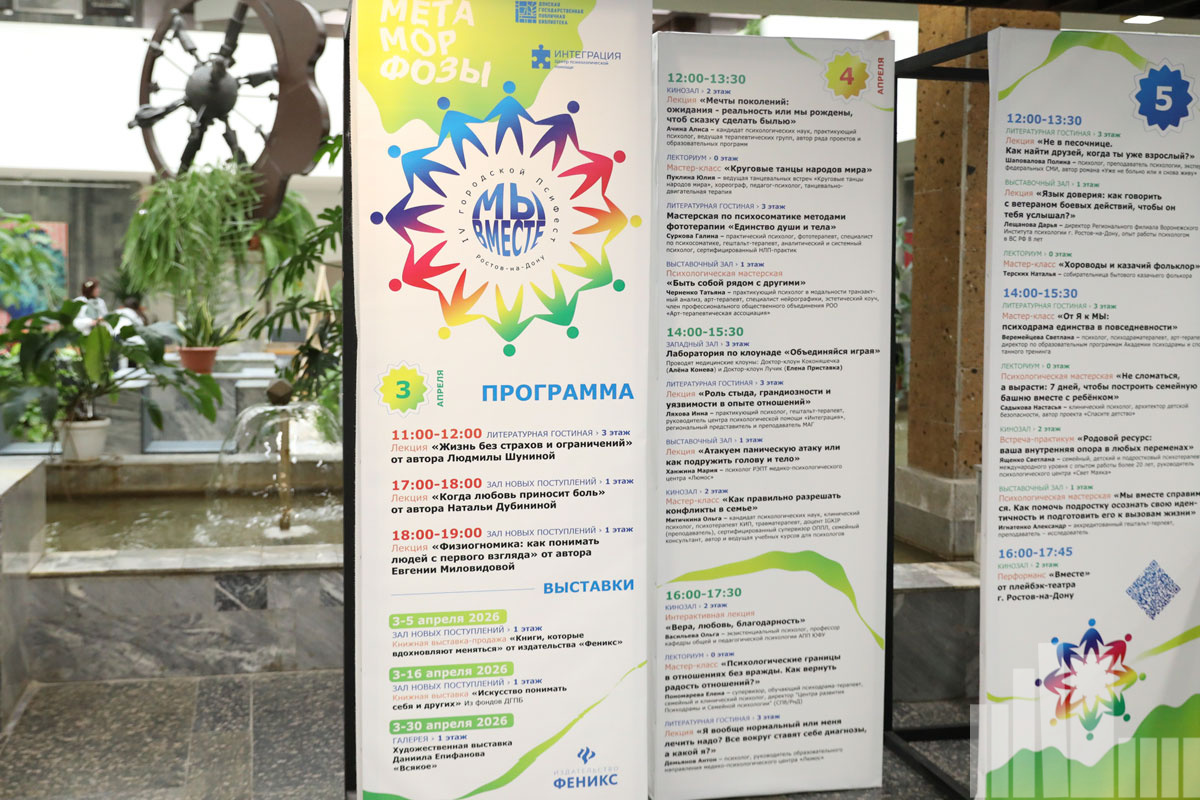 С 3 по 5 апреля в Донской государственной публичной библиотеке пройдет IV городской психологический фестиваль «Метаморфозы». В этом году он посвящен теме единства и получил название «Мы вместе» — в созвучии с объявленным в России Годом единства народов.