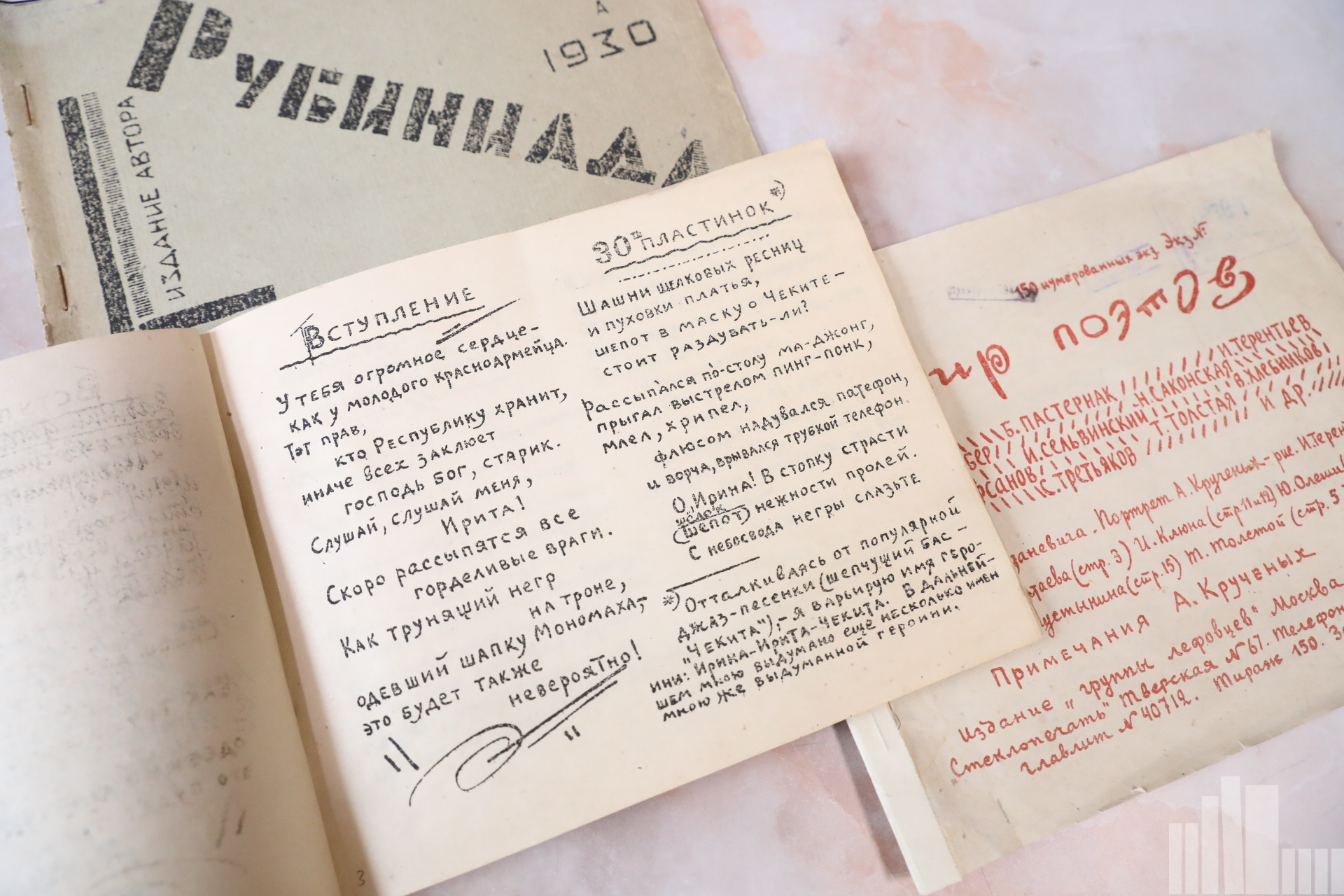 На выставке демонстрируются чрезвычайно редкие прижизненные издания произведений поэта, в том числе книги, изданные им в технике стеклографии.