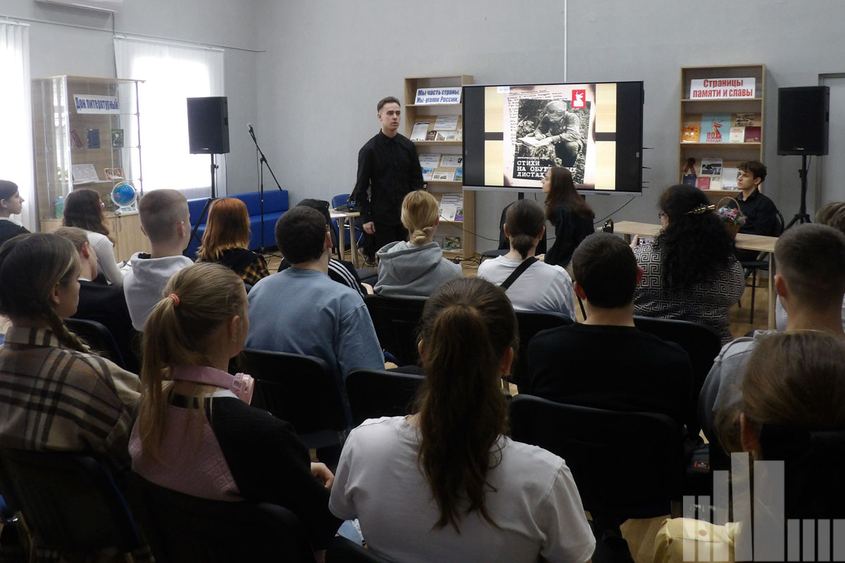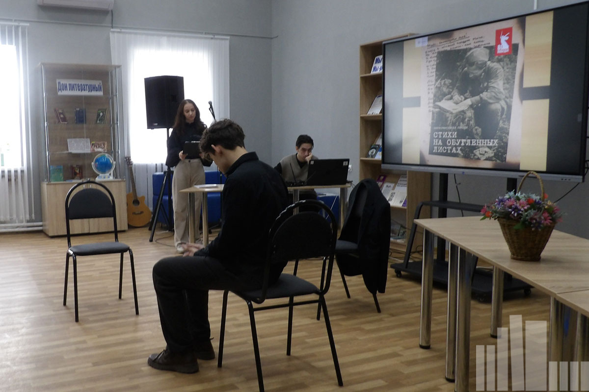Автор и ведущая мероприятия Дарья Цепкало, библиотекарь центра культурных программ Донской публичной библиотеки, выпускница Института филологии, журналистики и межкультурной коммуникации ЮФУ, говорила о том, что от первого до последнего дня Великой Отечественной войны не умолкал голос поэтов. Их яркие поэтические зарисовки и реалистичные репортажи с мест сражений расходились среди солдат на фронте и в тылу, поднимая боевой дух.