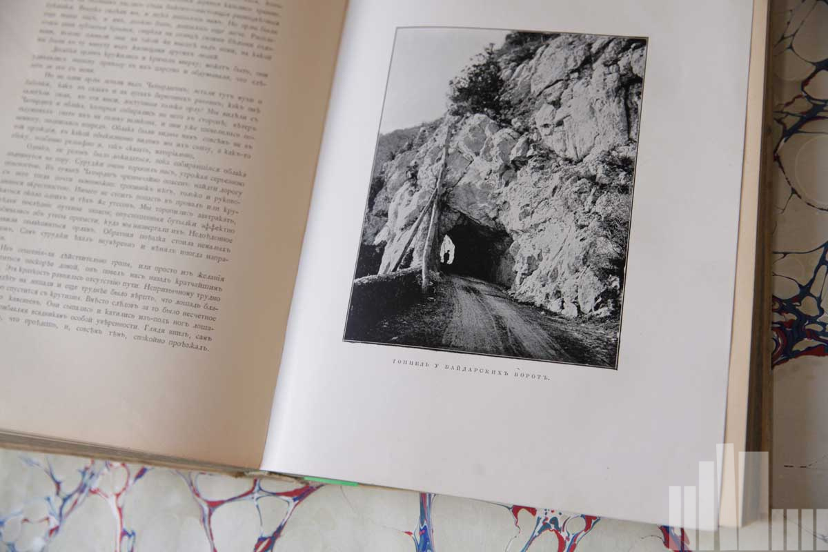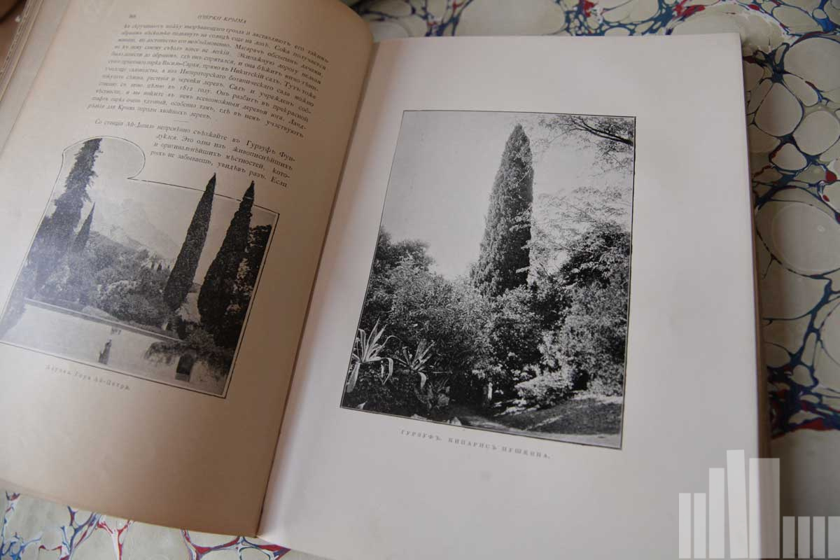 Издание «Очерков Крыма» 1902 года как раз и набрано шрифтом особенного начертания, не похожим на все прочие, с непривычным ритмом, который задают высокие, на высоту прописной буквы литеры к, ж, i, и необычный, скачущий набор цифр в датах. Неизвестный нам художник-гравер, подписавший свои заставки и концовки инициалом W, сумел во многих случаях подчеркнуть выразительность имевшихся в его распоряжении иллюстраций. Он то приглашает нас полюбоваться узором наличника входа в гарем ханского дворца, использованным для украшения шмуцтитула, то затейливой рамкой обрамляет видовой снимок, который от этого только выигрывает. Все это вместе и создает неповторимую магическую притягательность "Очерков Крыма".