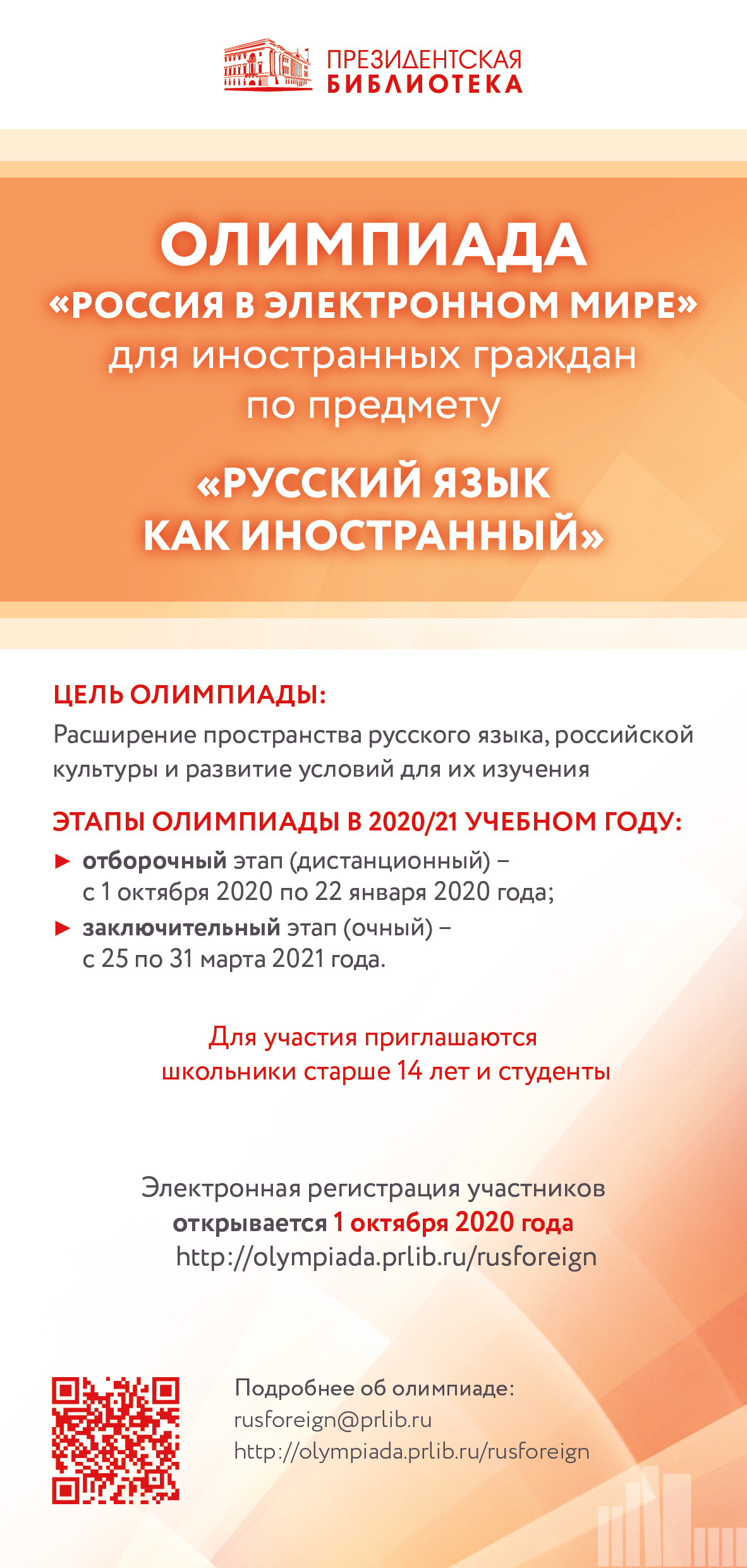 Олимпиада по русскому языку как иностранному проводится с 01 октября 2020 г. по 29 марта 2021 г. и включает два обязательных этапа: