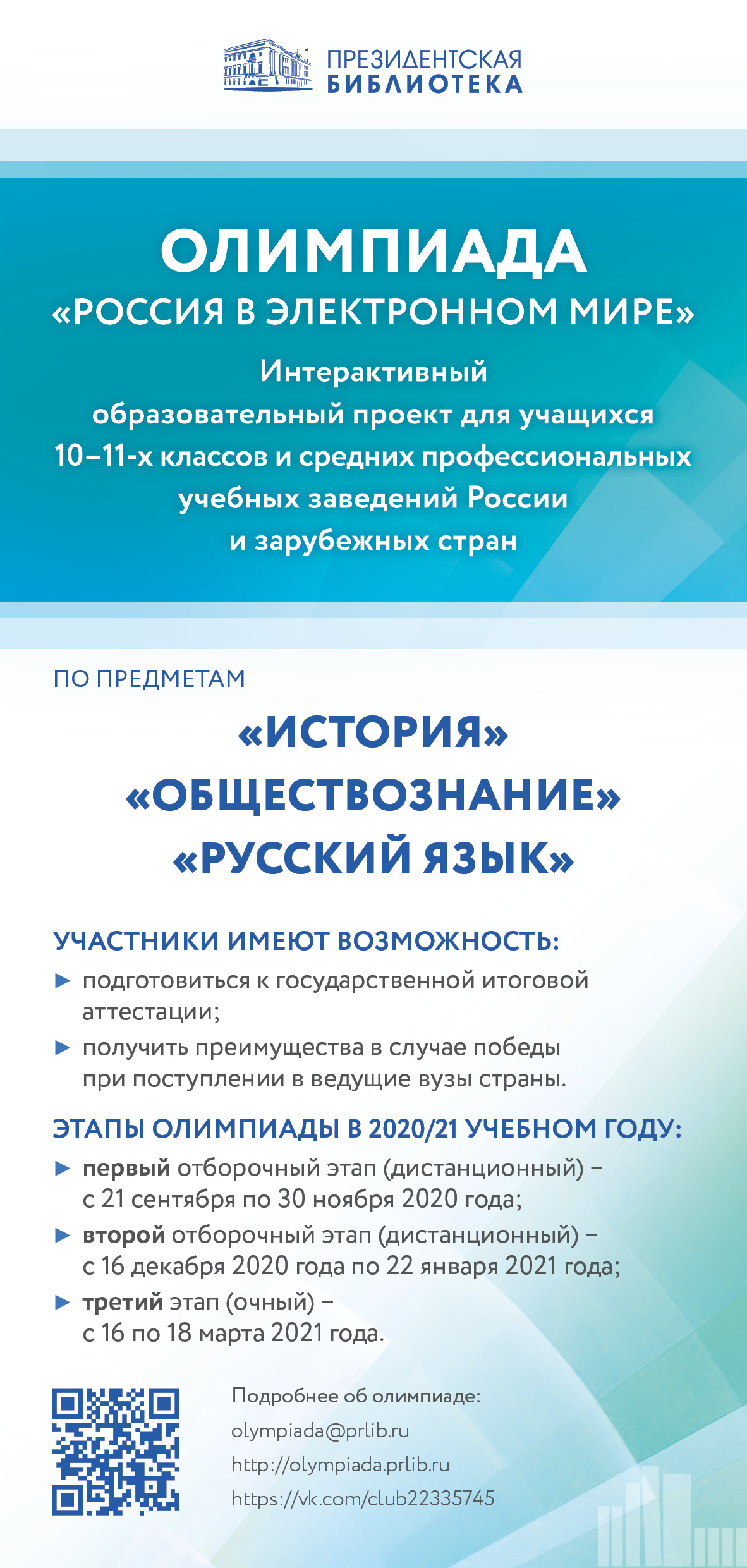 21 сентября, стартовала Всероссийская интерактивная олимпиада школьников «Россия в электронном мире» по предметам «История», «Обществознание», «Русский язык» и «Русский язык как иностранный».