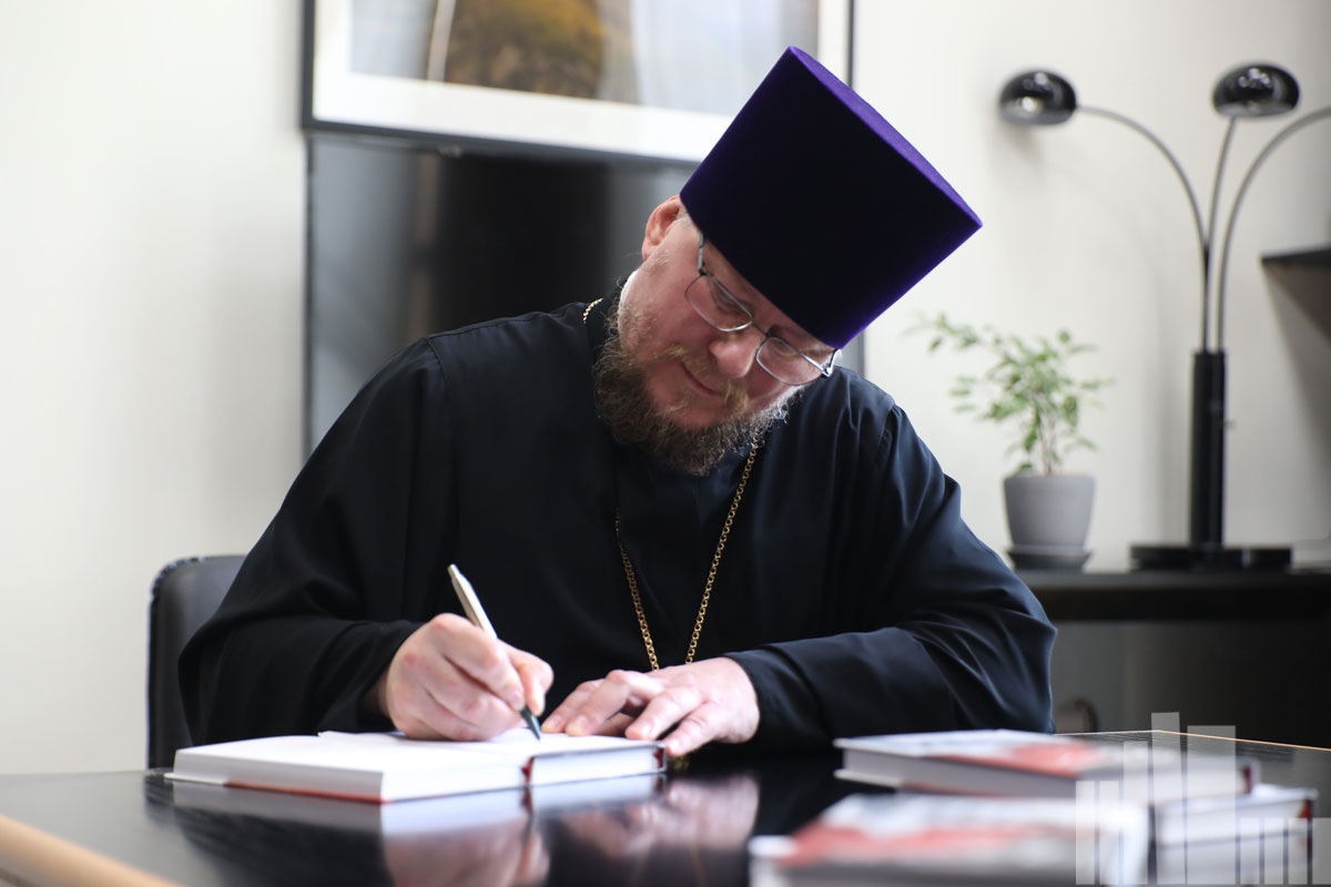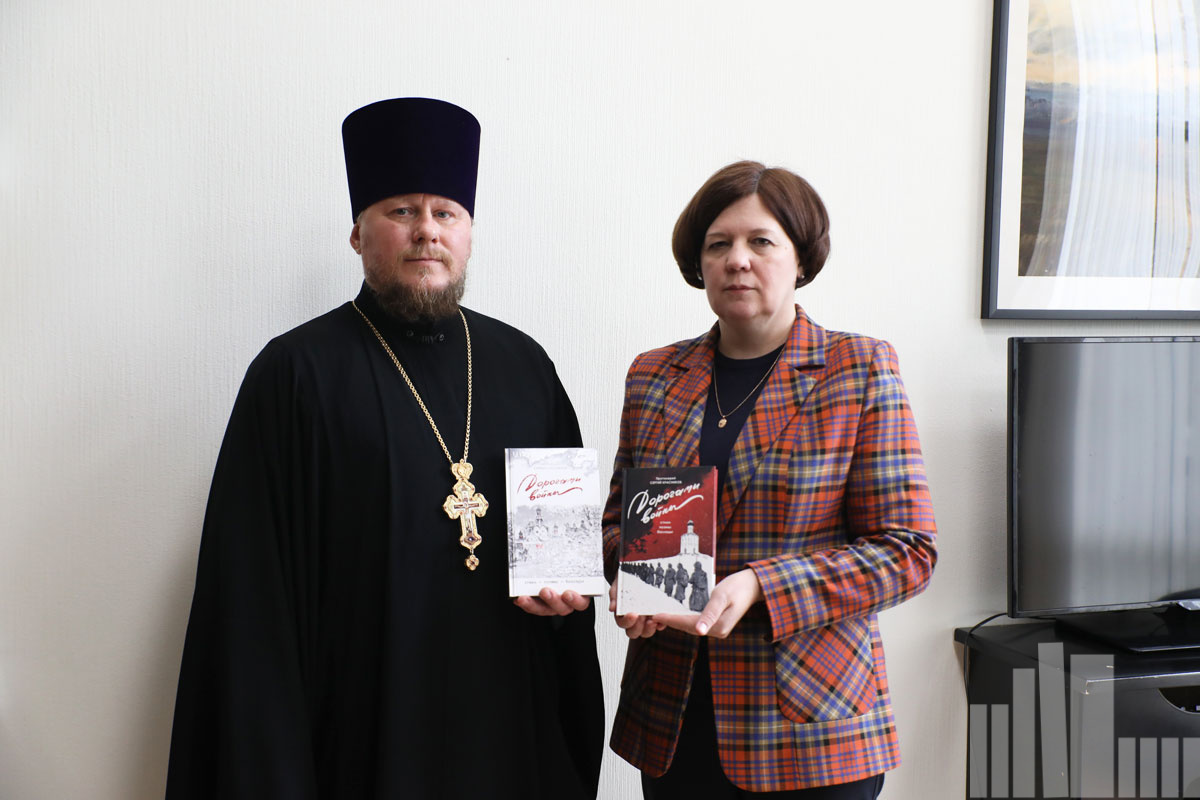 13 мая 2025 г. протоиерей Сергий Красников, настоятель храма Всех Святых, в земле Российской просиявших, передал в фонд Донской публичной библиотеке свою книгу стихов «Дорогами войны».