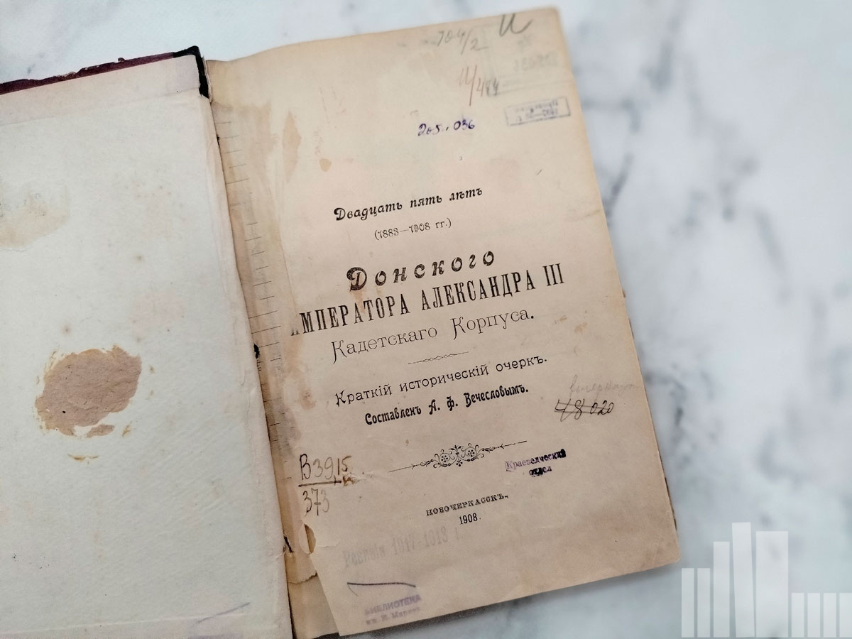 Вечеслов А. Ф., Двадцать пять лет (1883-1908 гг.) Донского императора Александра III кадетского корпуса : Краткий исторический очерк / Сост. А. Ф. Вечесловым. - Новочеркасск : Частная Донская типография, 1908. - [6], IV, [2], 204 с., [9] л. ил., портр. (инв. номера Р 205.036; 394.907).