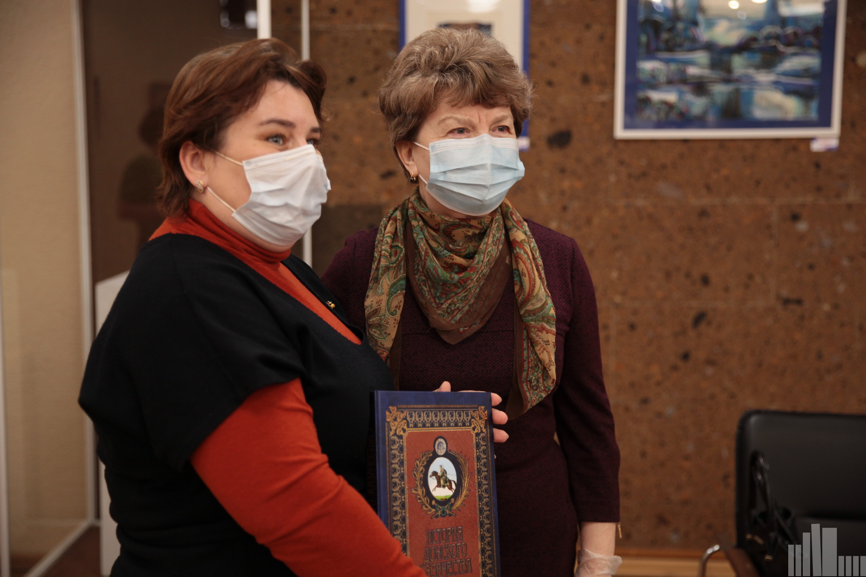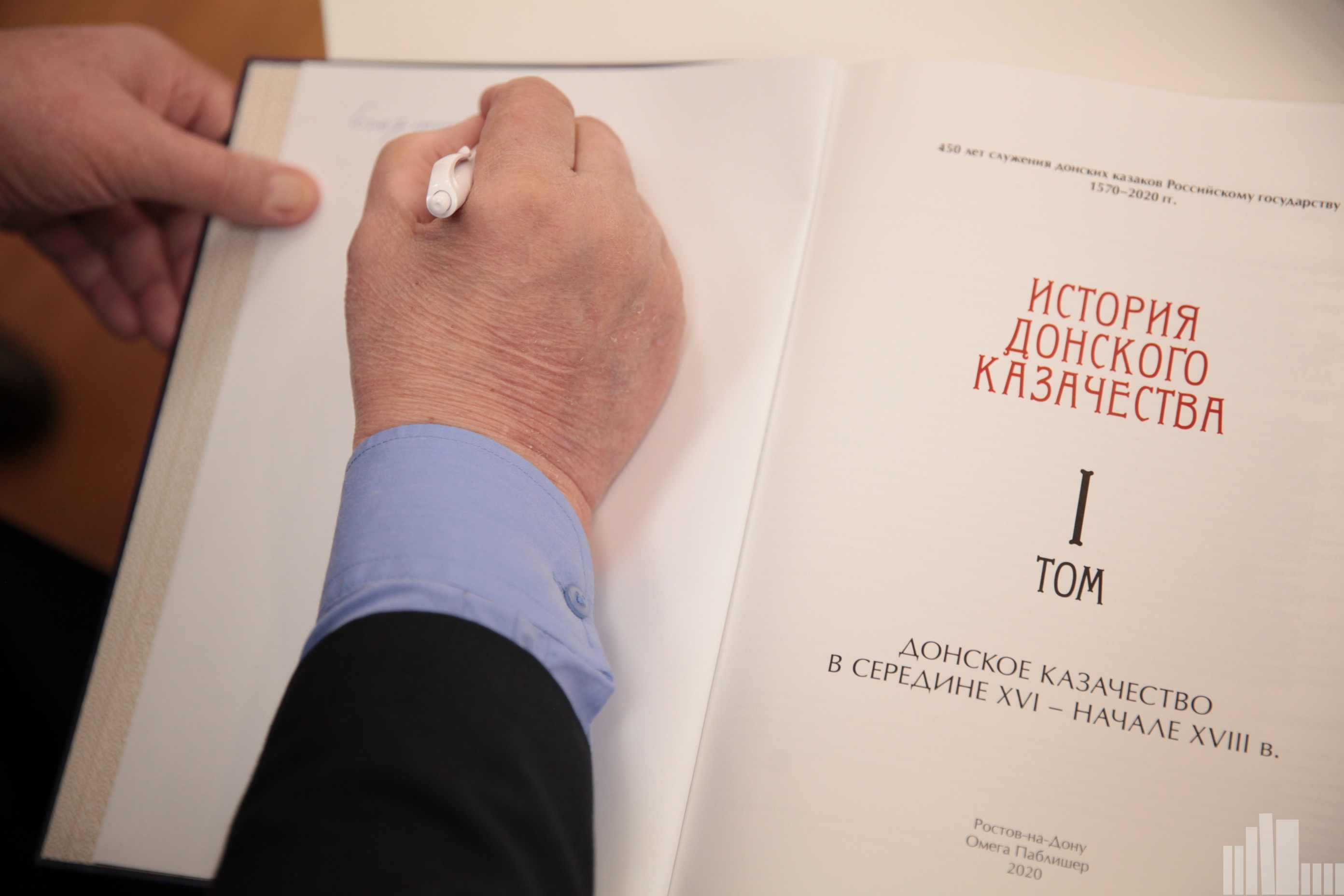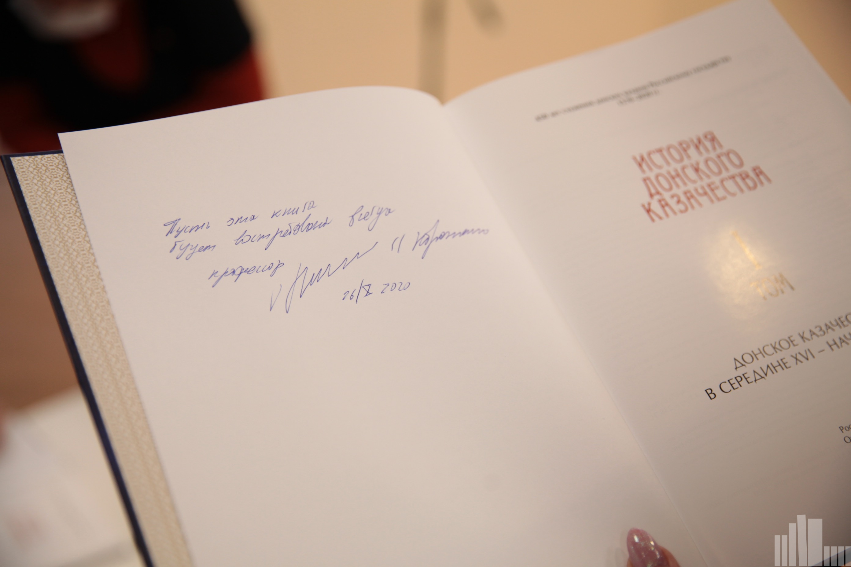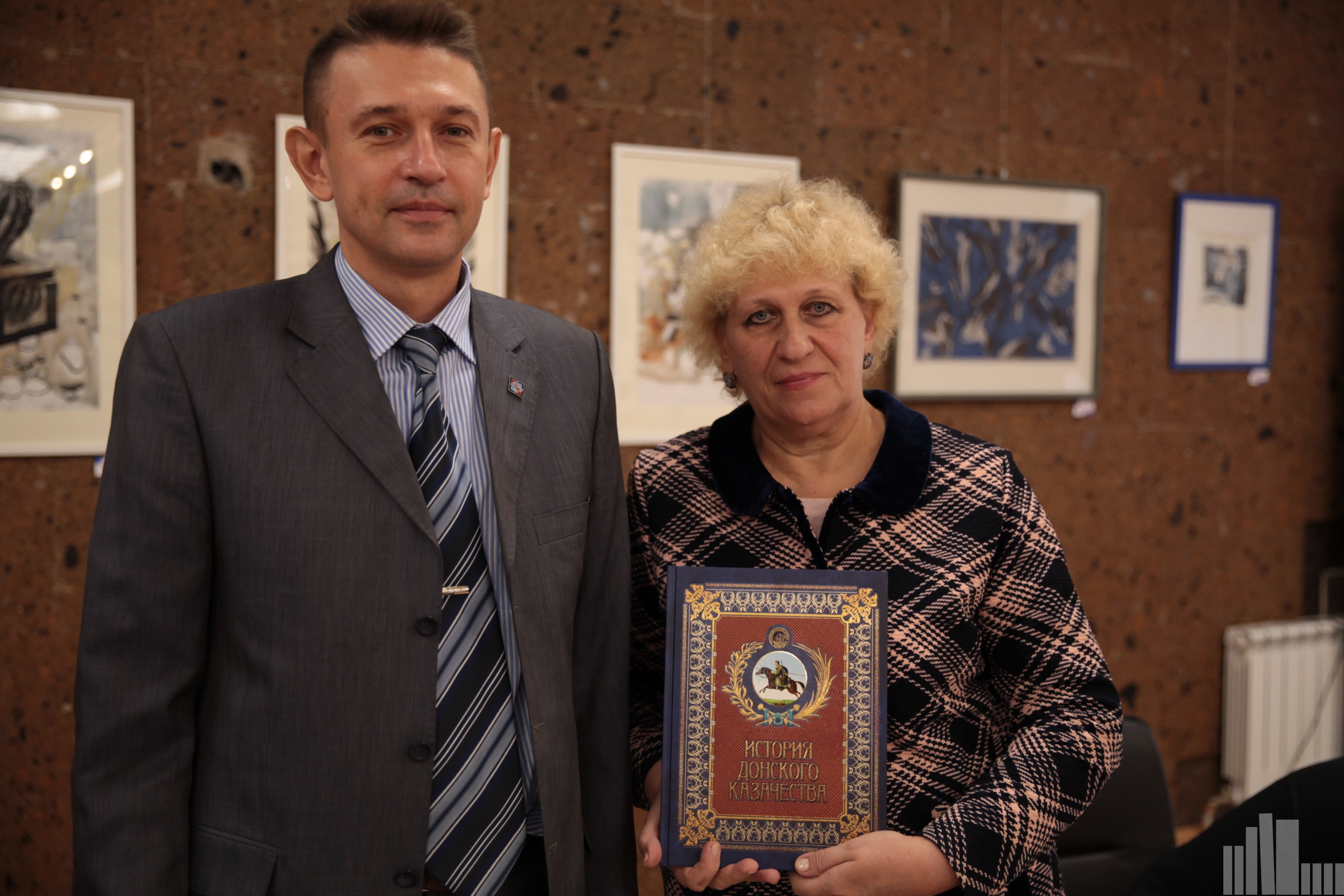 Вторая часть мероприятия была посвящена передаче уникального 3-томного научно-справочного издания «История Донского казачества» государственным и муниципальным библиотекам Ростовской области. Вручал издание директор департамента по делам казачества и кадетских учебных заведений Ростовской области Петр Николаевич Серов.