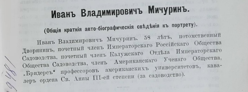 В мае того же года, когда готовился к печати июньский номер журнала, в редакцию «Садовода» пришло письмо из Козлова. Выполняя просьбу читателей и редакции, Иван Владимирович прислал свою фотографию и небольшую статью, озаглавленную «Общие краткие автобиографические сведения к портрету». Эта статья вместе с фотоснимком И. В. Мичурина была опубликована в шестом номере «Садовода» за 1914 год.