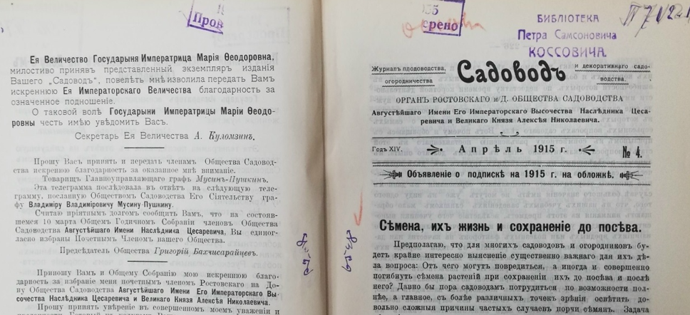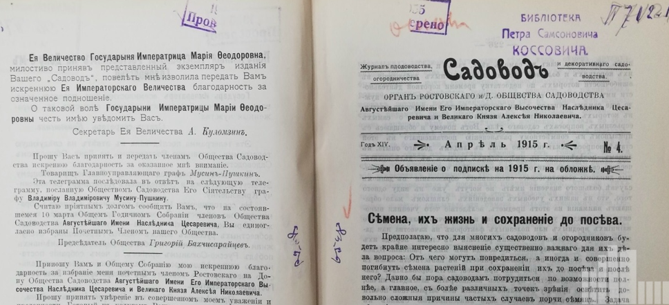В 1902 году в Ростове начал выходить журнал «Садовод». Издавало его местное общество плодоводства, огородничества и декоративного садоводства (орган Ростовского-на-Дону общества садоводства). На протяжении 1902–1916-х годов этот журнал можно было выписать в любом уголке России. Основной задачей журнала, как отмечалось в одном из первых номеров, было «служить интересам садоводства — русского вообще и донского в частности».