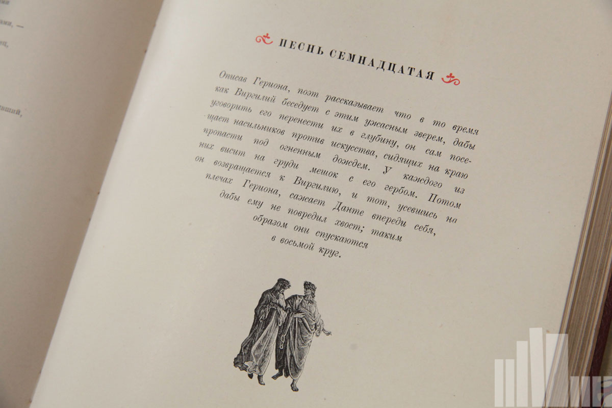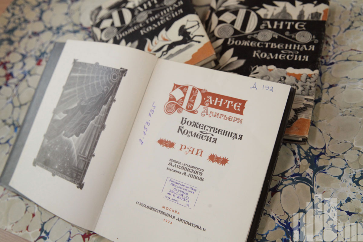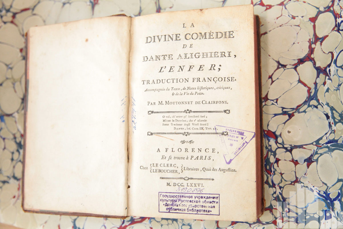 В экспозиции «Книжного вернисажа», подготовленной специалистами центра по работе с книжными памятниками Ростовской области представлено 6 изданий «Божественной комедии» конца 18-20 вв. Среди экспонатов: