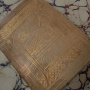 Книга в издательском цельнокожаном переплёте с золотым тиснением на обеих крышках и корешке, с декоративными тканевыми форзацем и нахзацем (муар) и тройным золотым обрезом.