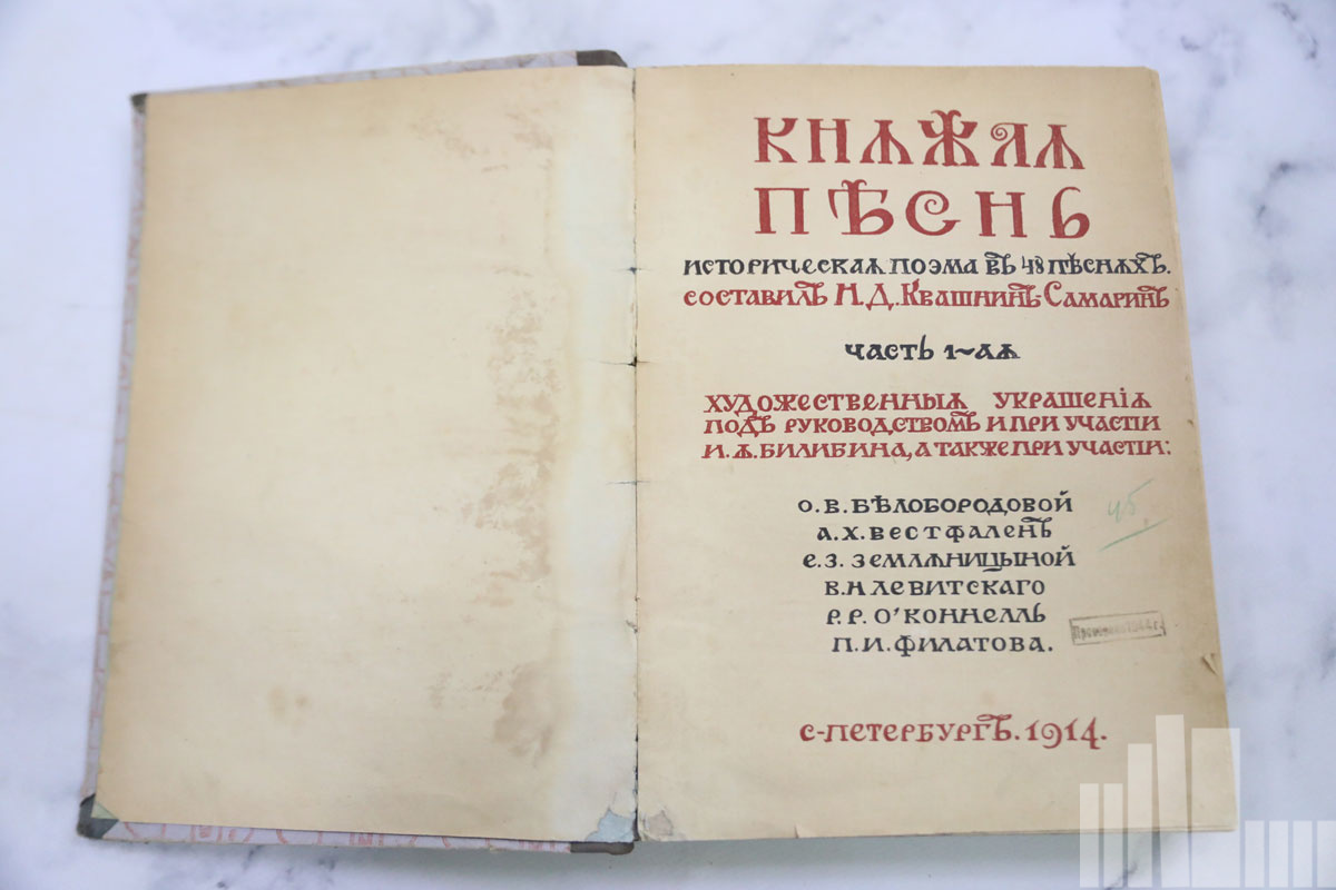 Квашнин-Самарин Н. Д. Княжая песнь: Историческая поэма в 48 песнях / Сост. Н.Д. Квашнин-Самарин; Худож. украшения под руководством и при участии И.Я. Билибина, а также при участии: О.В. Белобородовой, А.Х. Вестфален [и др.]. – Санкт-Петербург, 1914.