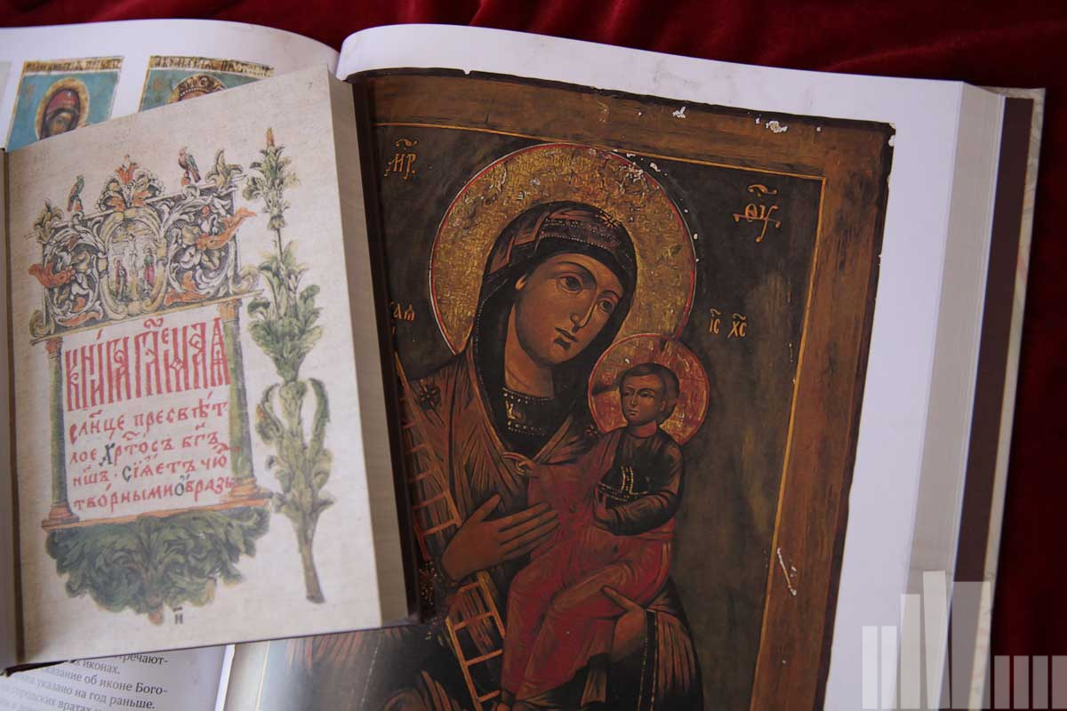 Два представленных на выставке издания «Солнце пресветлое» – это совместный проект Издательства «Панпресс» и Научной библиотеки Московского государственного университета им. М. В. Ломоносова. Первая книга содержит факсимильное воспроизведение экземпляра, хранящегося в Библиотеке Московского университета, дополненного недостающими материалами из экземпляра Исторического музея. «Солнце пресветлое» – свод сказаний о чудотворных иконах Богоматери, редчайшее сочинение Петровской эпохи. Сегодня известно всего два рукописных экземпляра этого сочинения, украшенных гравюрами с изображениями чудотворных икон. Основная часть гравюр взята из первого русского свода изображений чудотворных икон Богоматери, гравированного московским мастером Григорием Павловичем Тепчегорским в 1713 – 1714 годах, который дополнялся и видоизменялся в последующих гравированных изданиях.