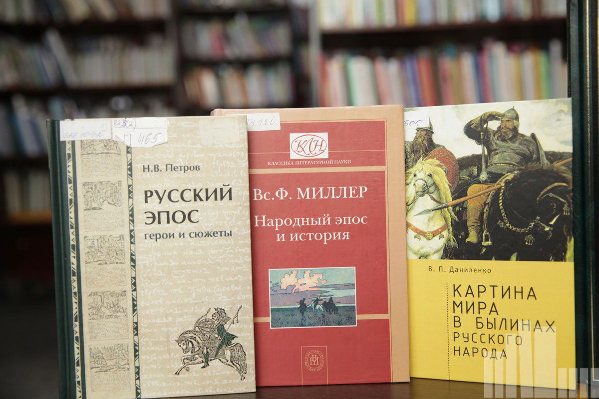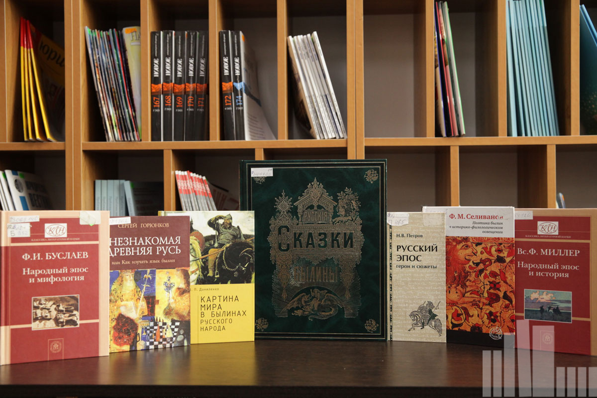 Самым первым исследователем былинного эпоса был Федор Иванович Буслаев (1818-1897). На выставке представлен его научный труд «Народный эпос и мифология». Работы этого выдающегося филолога не переиздавались более чем сто лет, поэтому этот сборник имеет еще большую ценность для исследователя. Здесь помещены наиболее значимые его работы, такие, как: «Русский народный эпос», «Эпическая поэзия», «Бытовые слои русского эпоса». Язык и мифология,- так считал ученый, то, что в первую очередь определило лицо народа и сформировало его духовное наследство. По его убеждению, поэтическое творчество народа основывалось на первобытных верованиях: древнейшие мифы и связанные с ними обряды. С течением времени, мифологические сюжеты былин стали по содержанию героическими, повествуя о подвигах героев и исторических личностей. По мнению ученого, народные певцы былин верно понимали исторические события и отражали их в своем повествовании, что свидетельствует о заинтересованности народа исторической судьбой Родины.