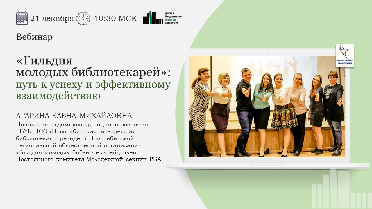 В рамках вебинара участники познакомятся с целями и задачами Новосибирской региональной общественной организации «Гильдия молодых библиотекарей» – первой в России официально зарегистрированной молодежной библиотечной профессиональной организацией, проанализируют примеры активизации деятельности молодых библиотекарей региона, изучат вопросы профессионального сплочения и развития членов организации и смогут получить в подарок методическое пособие «Молодежь, объединяйся!».