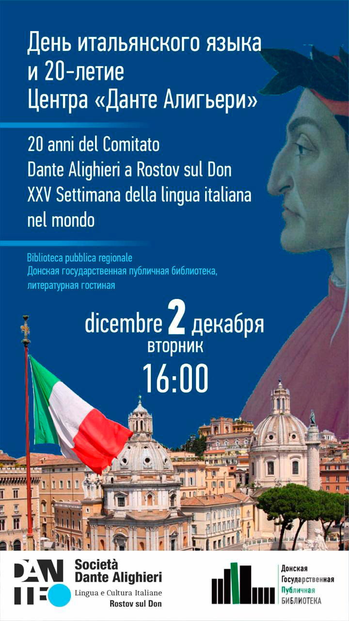 Российско-итальянский культурный Центр «Данте Алигьери» приглашает на мероприятие, приуроченное к Международной Неделе итальянского языка, а также к 20-летнему юбилею Центра «Данте».