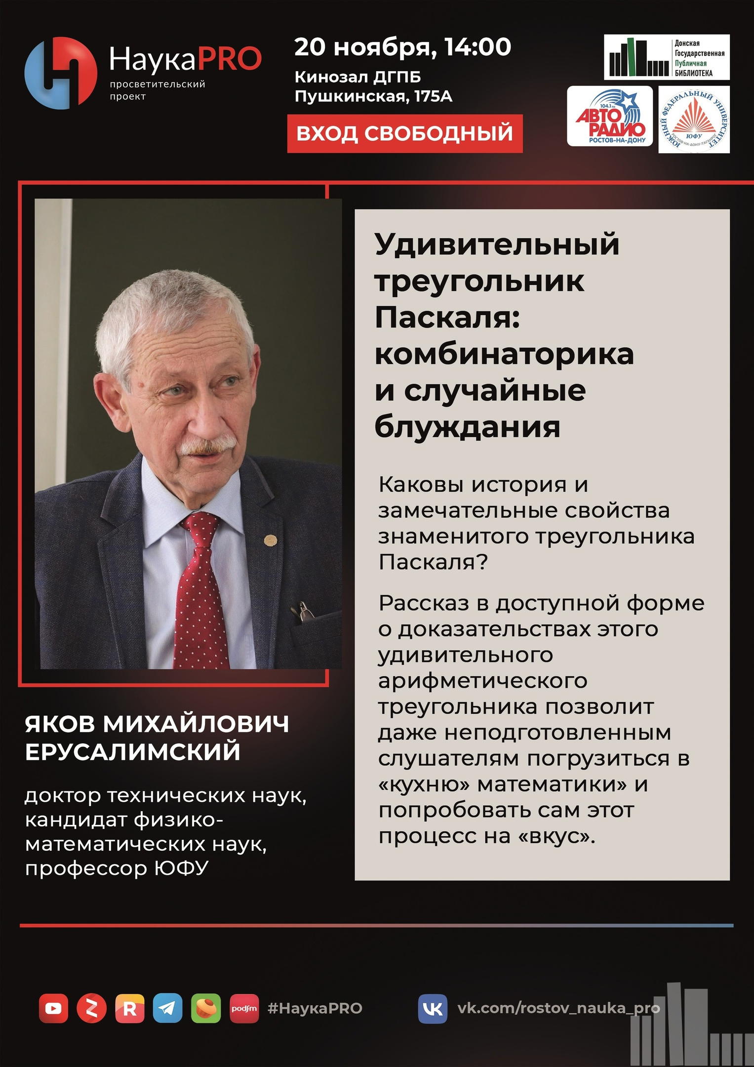 Слушатели познакомятся не только с историей и замечательными свойствами знаменитого треугольника Паскаля, но и с некоторыми результатами автора, связанными с этим удивительным арифметическим треугольником. Последние будут приведены с доказательствами, рассказанными в доступной форме. Это позволит даже неподготовленным слушателям погрузиться в «кухню» математики» и попробовать этот процесс на «вкус».