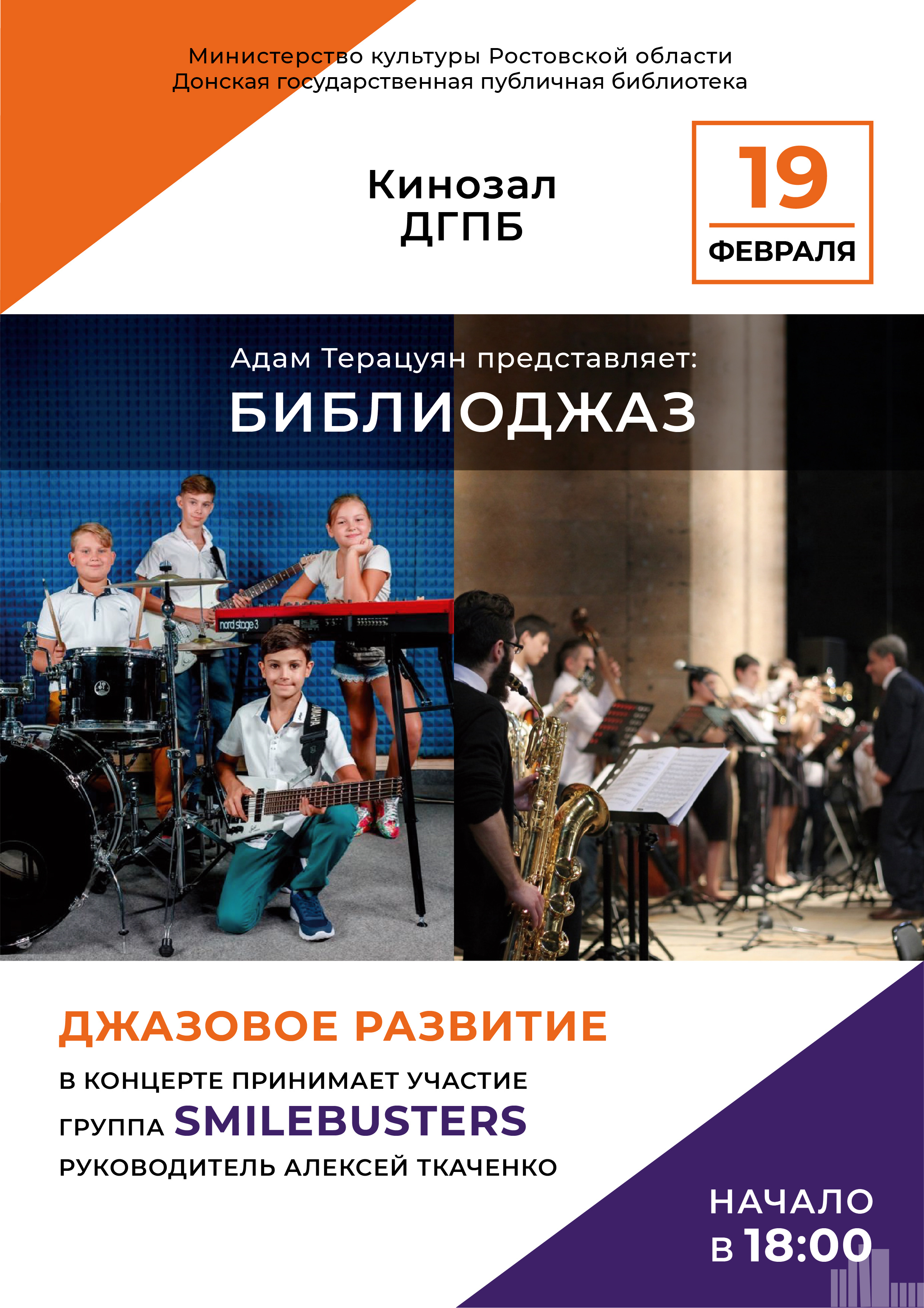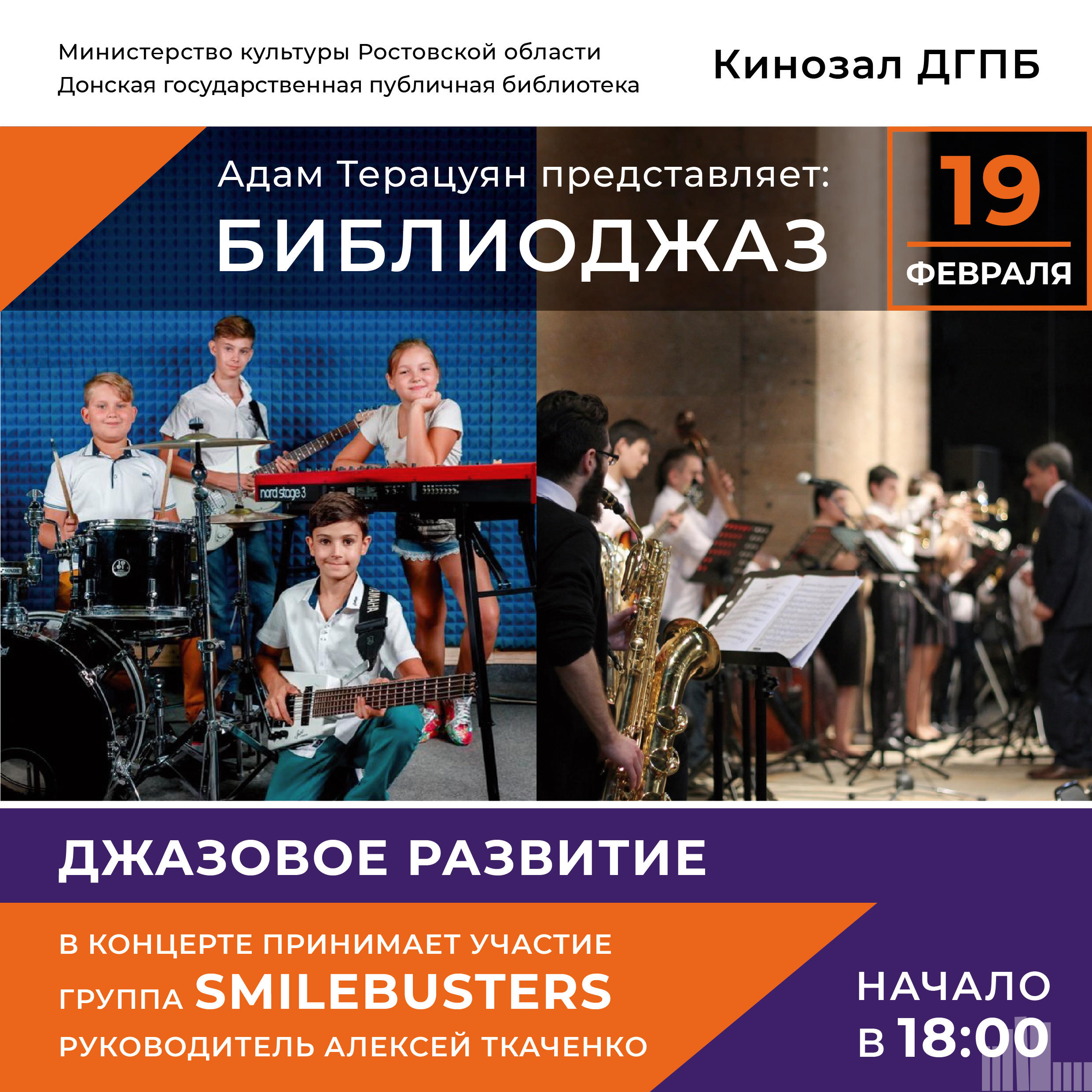 19 февраля в 18-00 в кинозале библиотеки в рамках проекта «Библиоджаз» состоится концерт «Джазовое развитие». Участники - SMILEBUSTERS, руководитель Алексей Ткаченко. Приглашаем всех желающих. Вход свободный.