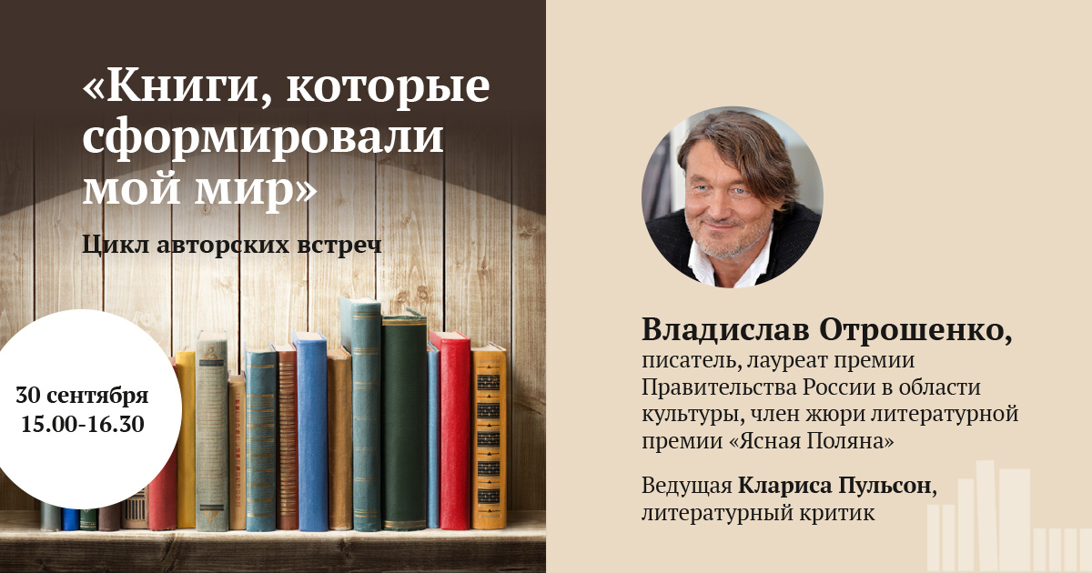 15.00 – 16.30 – онлайн встреча с Владиславом Отрошенко, писателем, Лауреатом премии Правительства России в области литературы, членом жюри литературной премии «Ясная Поляна»